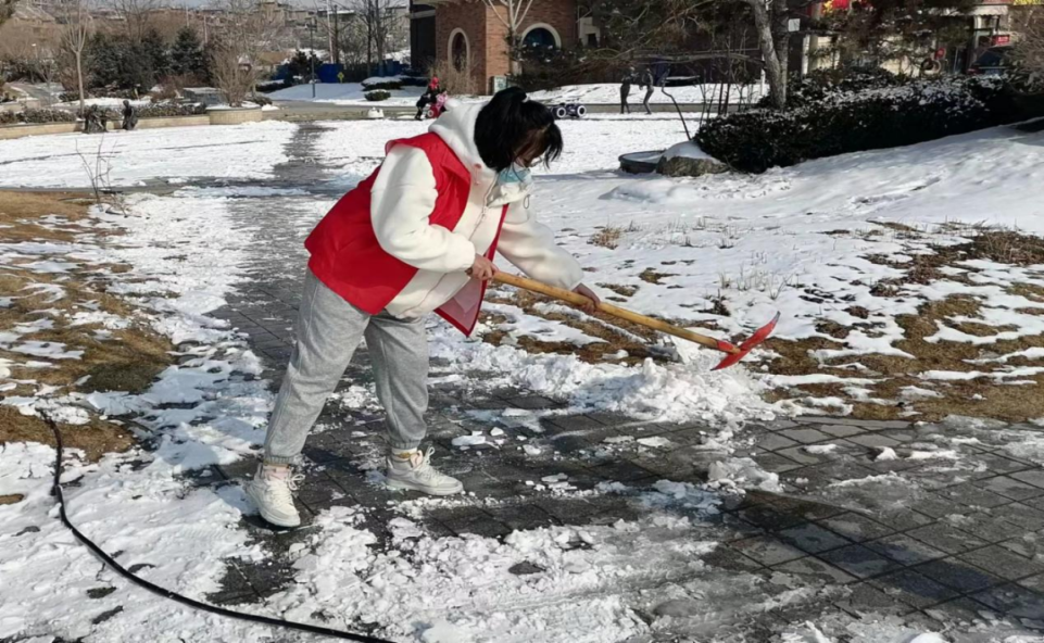 孔雪婷在假期回到兰考县参与当地社区组织的社会实践活动。恰逢初雪,道路积雪多,为保障居民安全出行,在社区带领下,她与社区工作人员共同参与扫雪任务。孔雪婷主要负责将积雪覆盖的区域清出行走道路,供居民出行,防止居民滑倒。在与社区工作人员的共同努力下很快将道路积雪问题解决,为当地居民提供了一个较为安全的出行环境。