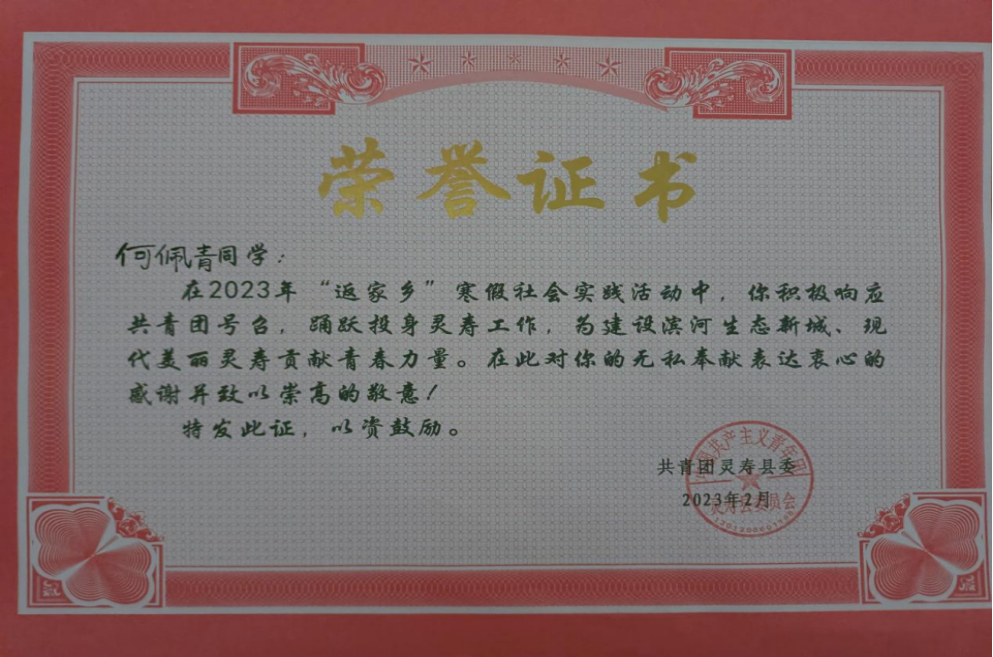 何佩青参加2023年“返家乡”寒假社会实践活动的证书。