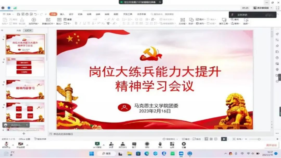 为深入学习贯彻党的二十大精神,贯彻落实习近平总书记关于青年工作的重要思想,贯彻落实习近平总书记视察新疆重要讲话重要指示精神,完整准确贯彻新时代党的治疆方略,锻造忠诚干净担当的团干部队伍,切实提升团的组织力、引领力、服务力,特此马克思主义学院响应校团委“岗位大练兵、能力大提升”活动,于2023年2月16日17:00在腾讯会议上召开集中学习会议,以提升理论素质、锤炼业务本领、强化新青年责任担当。