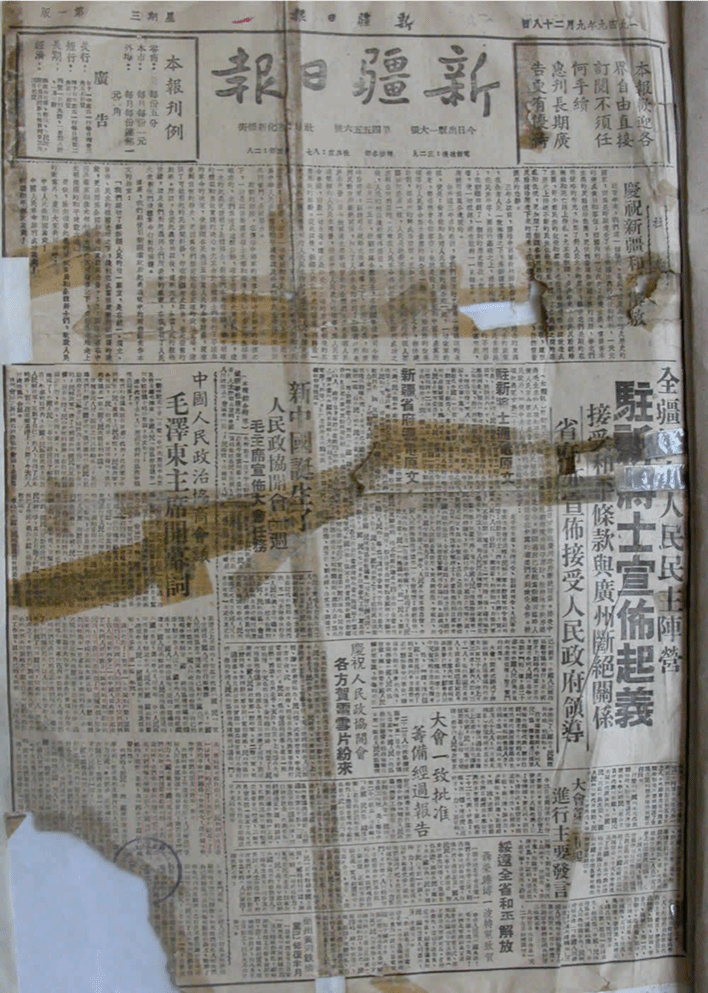 翻开1949年9月28日的《新疆日报》,社论《庆祝新疆和平解放》与《全疆归向人民民主阵营——驻新将士宣布起义》的稿件出现在头版醒目位置。