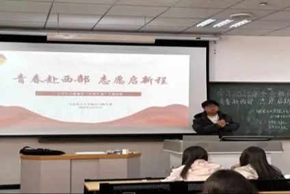 鲁迅曾言:“此后如竟没有炬火,我便是唯一的光。热爱之所以有力量,就在于前进道路上的坚守指引我们前行。”为深入学习贯彻西部计划,号召广大青年找到适合自己的职业道路,增长才干、施展才华,激励着更多的有志青年,到基层去、到祖国最需要的地方去,到祖国最需要的地方去,唱响建功立业的时代旋律。2025年3月12日,根据校团委统一部署,马克思主义学院团委开展以“青春赴西部,志愿启新程”为主题的团课活动。