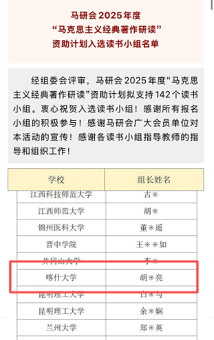 10月19日,中国高等教育学会马克思主义研究分会公布2025年度“马克思主义经典著作研读”资助计划入选小组名单。本次专项计划支持北京大学、清华大学等来自全国各地高校的不同学历层次的142个读书小组入选。喀什大学马克思主义学院“胡杨青年”读书小组成功入选立项,这是本校学生读书小组第一次入选全国“马克思主义经典著作研读”资助计划。