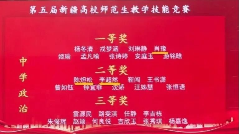 11月22日在昌吉学院举办的第五届新疆高校师范生教学技能竞赛落下帷幕,喀什大学马克思主义学院学生凭借扎实的专业功底、出色的教学素养和稳定的现场发挥斩获佳绩。其中,肖豫同学荣获中学政治组一等奖,陈炟松、李超然同学荣获中学政治组二等奖,充分展现了马克思主义学院师范生培养的丰硕成果,为学校赢得了荣誉。