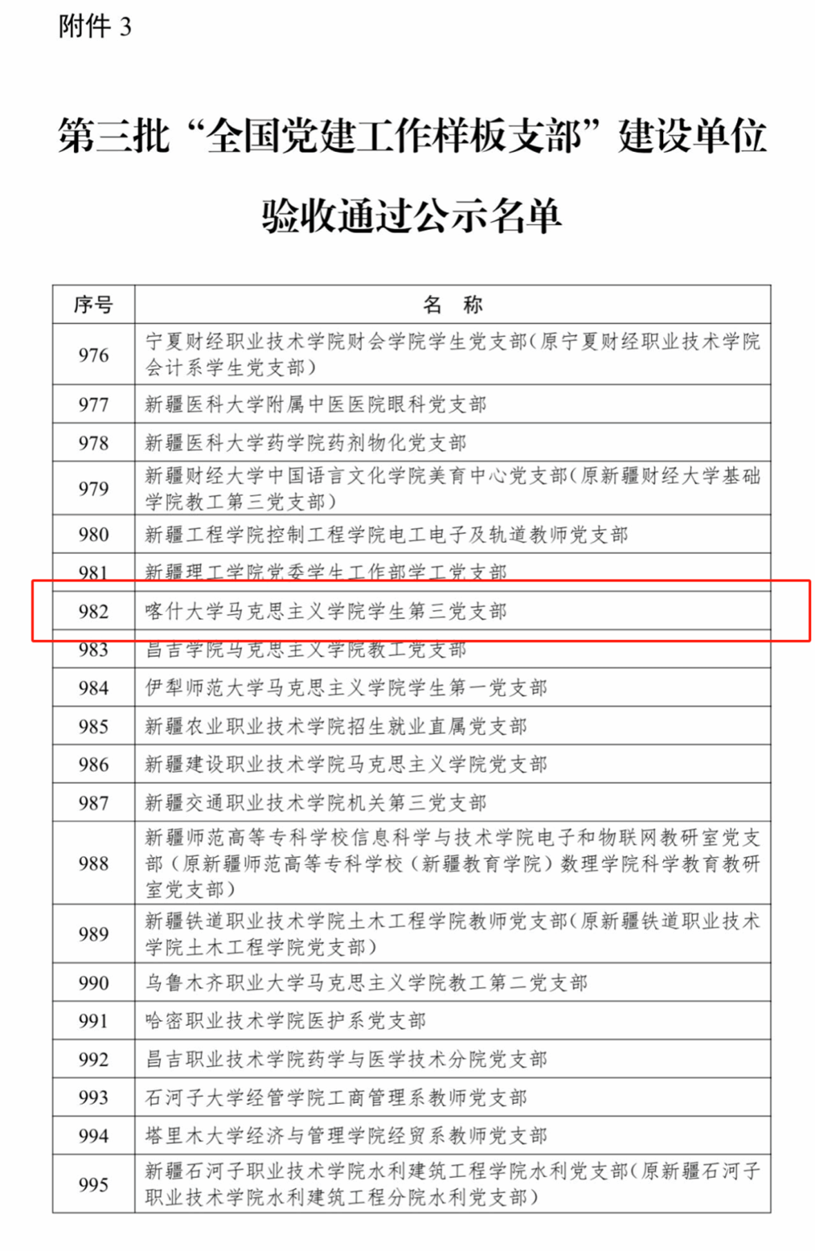 8月27日,教育部公示了第三批新时代高校党建示范创建和质量创优工作和第二批高校“双带头人”教师党支部书记工作室建设单位验收结果,拟认定10个高校党委、99个院系党组织、995个党支部、100个“双带头人”教师党支部书记工作室通过验收。其中喀什大学马克思主义学院学生第三党支部通过第三批“全国党建工作样板支部”建设单位验收。