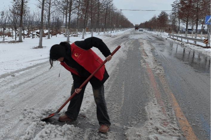 马克思主义学院2305班李婉莹同学在河南省周口市川汇区杨庄村积极投身志愿服务活动。李婉莹同学冒着严寒,拿起铁锹、扫帚等工具,到村庄关键区域进行积雪清扫,让居民们的出行有了安全保障。此次扫雪活动不仅营造了和谐美好的居住环境,还充分展示喀什大学学子的无私奉献之情。