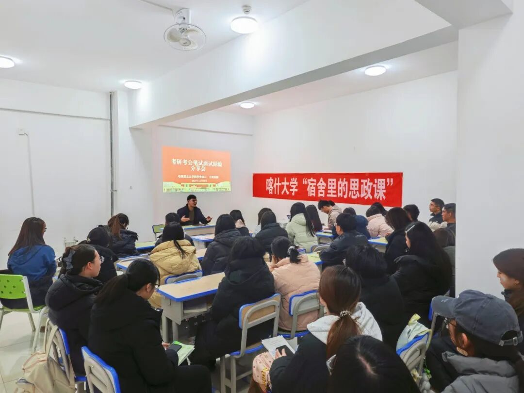 为扎实推进思政教育工作深入学生社区,发挥党支部引领作用和朋辈示范效应,助力学生明确发展目标、提升备考效能,马克思主义学院学生第三党支部于2025年12月31日在新泉校区1号宿舍楼举办了“宿舍里的思政课”第九期——考研考公经验分享会。本次活动聚焦考研、公务员及选调生考试的笔试面试经验分享。学院团委副书记阿迪里·托乎尼亚孜主持活动,40余名大二、大三学子踊跃参与。