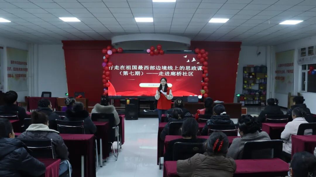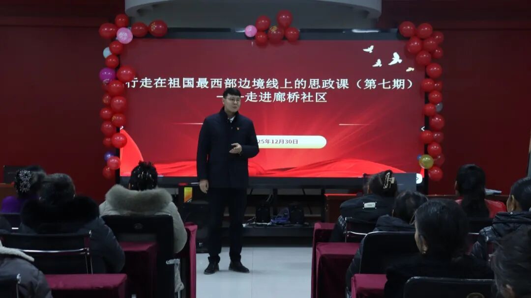 为铸牢中华民族共同体意识,推动思政课程与实践育人深度融合,马克思主义学院于2025年12月30日在廊桥社区举办了“行走在祖国最西部边境线上的思政课”第七期活动。学院党委副书记胡邦宁、团委书记郭迪、团委副书记阿迪里·托乎尼亚孜带队参加,并向社区捐赠了实用物资。