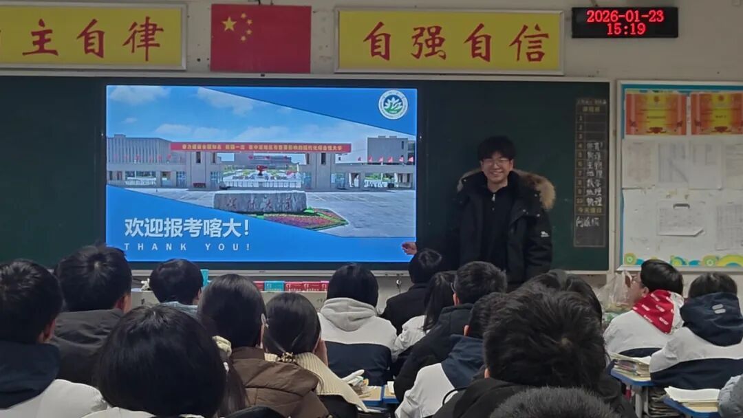 宣讲尾声,刘浩然鼓励同学们以积极心态冲刺高考,明确目标院校方向,并主动留下联系方式,为后续想了解喀什大学的学弟学妹提供持续咨询。