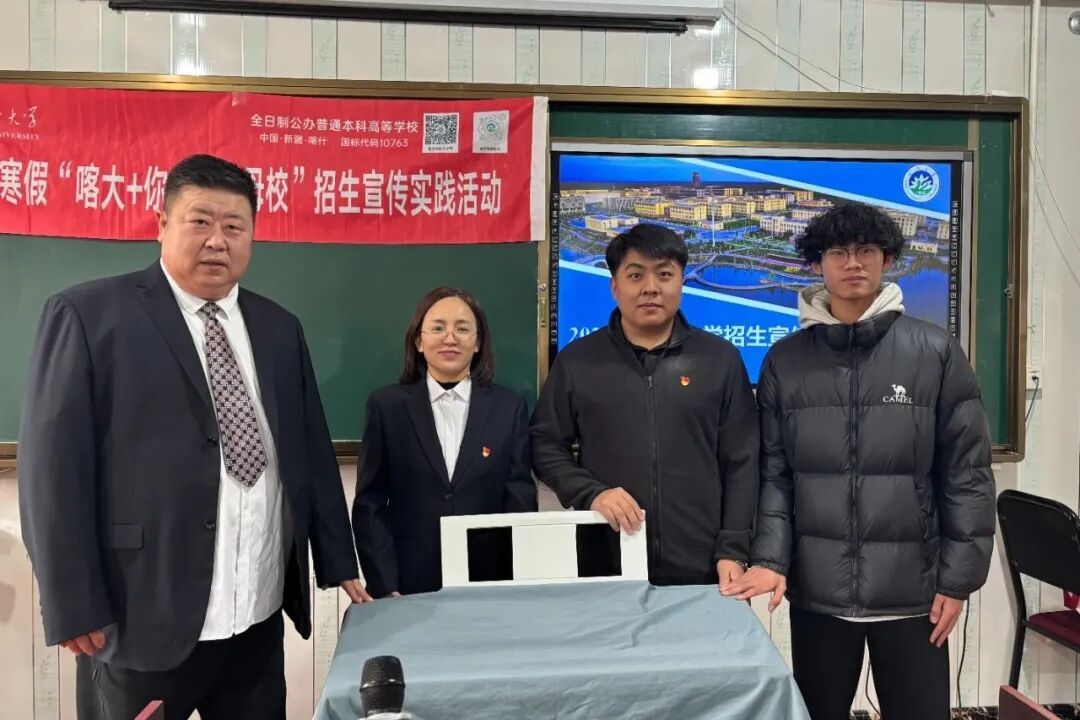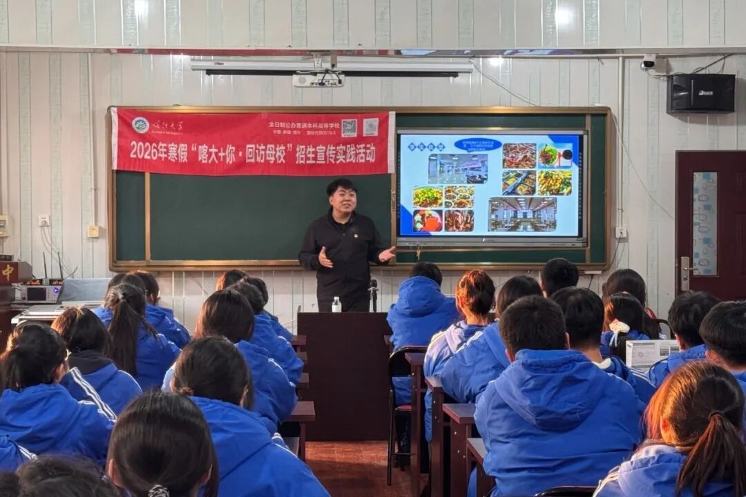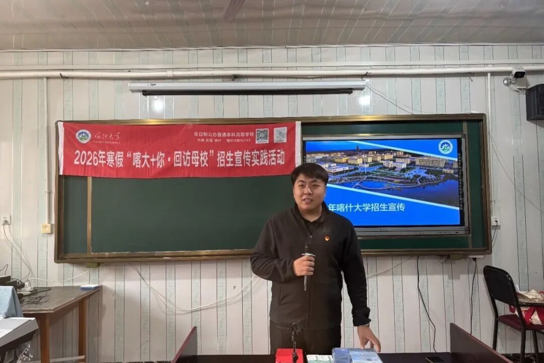 为响应喀什大学招生宣传号召,充分发挥在校生的桥梁纽带作用,分享边疆求学故事、解读喀大办学优势、搭建辽疆两地教育桥梁。2026年1月18日,喀什大学“喀大+你”回访母校实践团来到沈阳市辽中区新时代私立高级中学,在学校报告厅面向高三学生代表开展主题招生宣传活动。